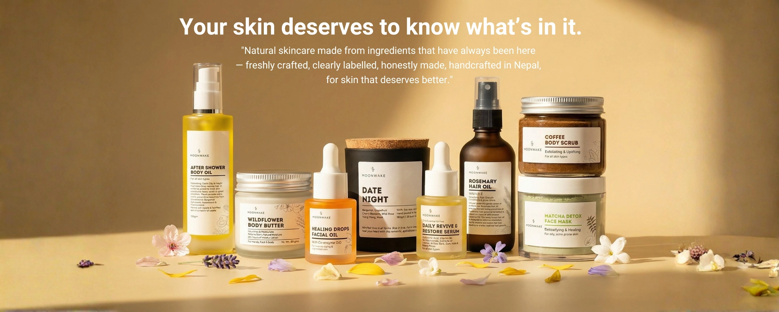 Moonwake makes natural skincare by hand in Nepal, using locally sourced botanicals like Chiuri butter and rosemary. No synthetic preservatives, no mineral oil, no hidden ingredients — just what your skin actually needs, clearly labelled and honestly made.