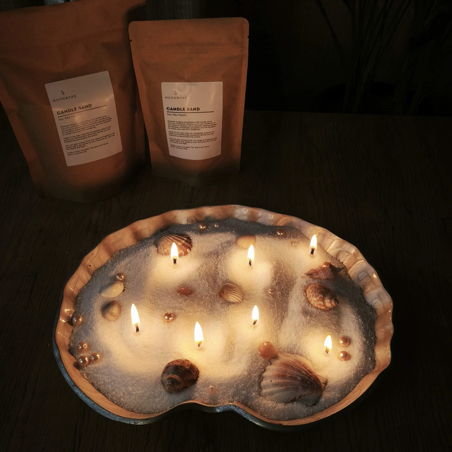 Made from 100% natural, vegan soy wax, these tiny pearl-shaped wax granules look and feel like soft sand, but melt into a clean-burning candle once the wick is lit. Their non-sticky, smooth texture makes them incredibly easy to work with, even for beginners.