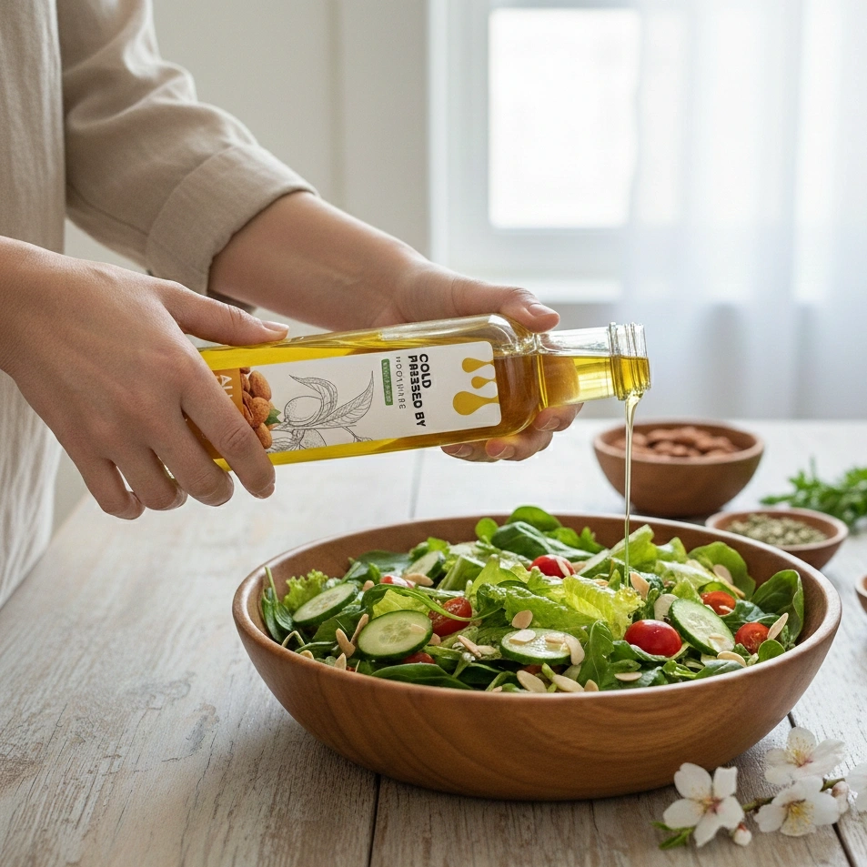 Almond oil is subtle and smooth with a gentle nutty scent. In the kitchen, it works well in light cooking and dressings, adding a hint of flavor without dominating. On skin, it’s very moisturizing and absorbs well. It feels gentle and calming — ideal for daily use on face, body, and hair.